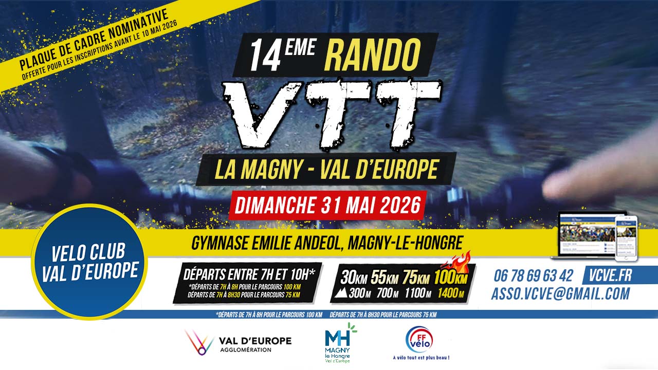 Nous sommes heureux de vous proposer notre 14ème Rando VTT La Magny / Val d’Europe. Nous proposons 4 randonnées pour tous les niveaux, les traces seront publiées prochainement. Nous vous attendons nombreux !